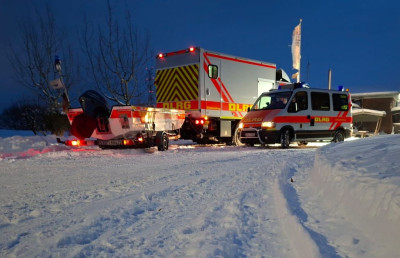 Vor Ort wurde bei der Erkundung durch die ersten Helferinnen und Helfer dann festgestellt, dass sich der Skipper noch an Bord seines in Schräglage liegenden 2 Masters befindet.