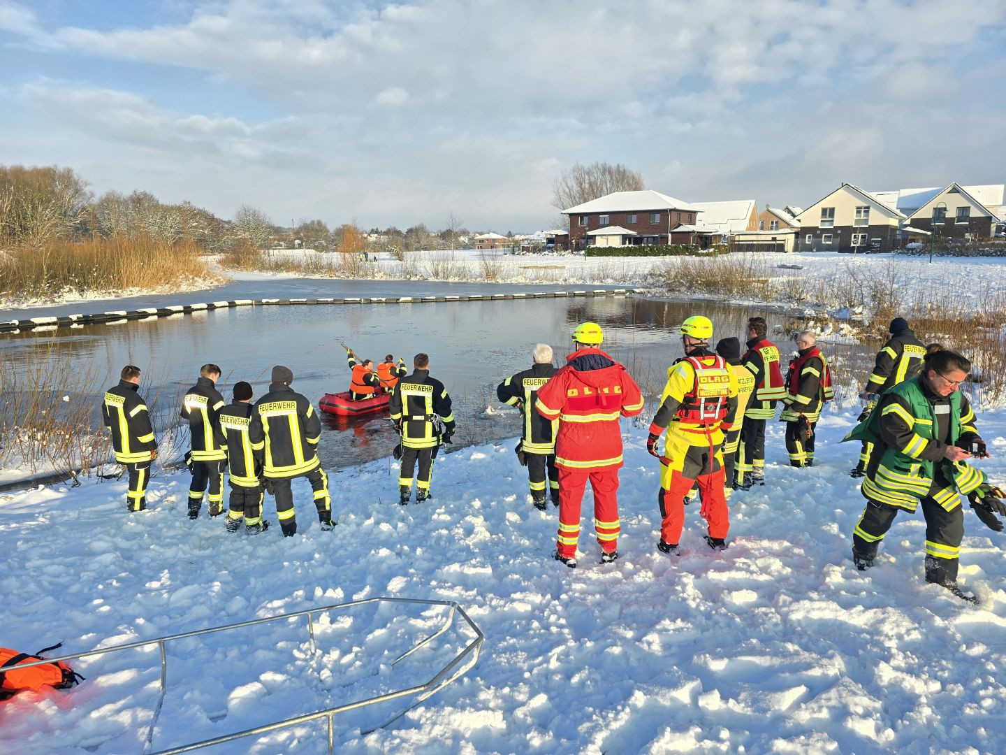 Gemeinsam mit der Feuerwehr Harsefeld wurde in einem Regenrückhaltebecken im Stubbenweg nach einem dort hineingerutschten und versunkenen Hund.gesucht.